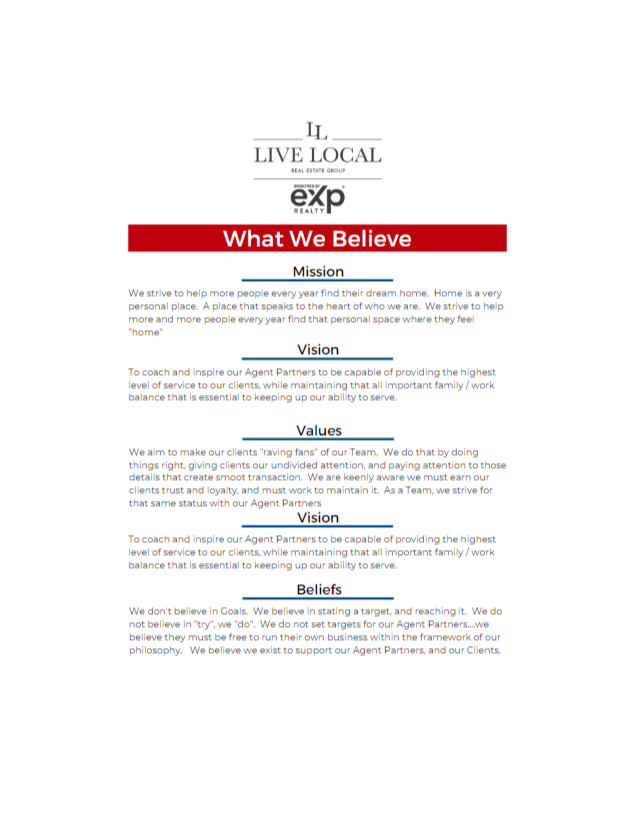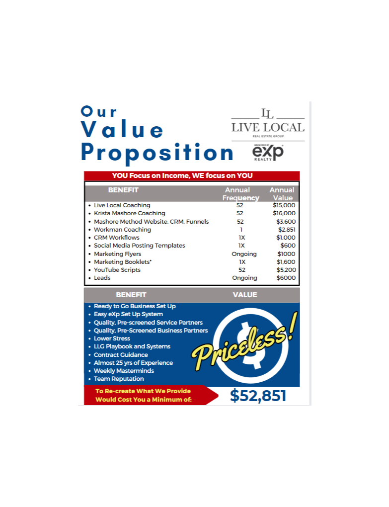 The Live Local Real Estate Group provides what agents need to propel their business to the next level.. Our Group provides customizable flyers, booklets, eamil marketing materials, werkflows and more. Most important, we make sure our partner agents have the training needed to use them to their full advantage.